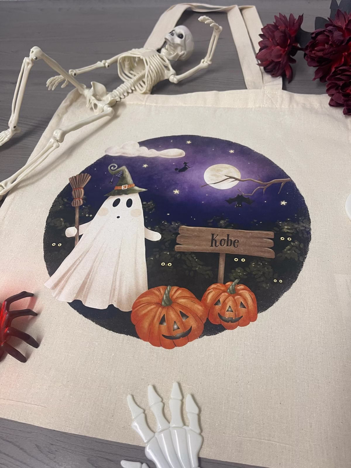 Een betoverende Halloween-totebag, perfect om snoepjes in te verzamelen of gewoon als super leuke herfsttas.