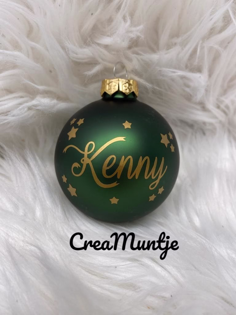 Lichtblauwe glazen kerstbal (7cm) met naam naar keuze.